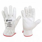Guanti in fiore di vitello bianco orlato. Discreta sensibilità e morbidezza, adatti nel settore agricolo, carico e scarico, conduzione di automezzi, nel settore meccanico, lavorazione lamierati, consigliati a tutti coloro che hanno problemi di sudorazione con guanti in gomma o maglia rivestiti in NBR o lattice. CE EN 388 (2142) CE EN 420.