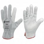 Guanti in fiore di vitello bianco orlato, dorso in crosta. Discreta sensibilità e morbidezza, adatti nel settore agricolo, carico e scarico, conduzione di automezzi, nel settore meccanico, metalmeccanico, edilizia, industria in genere, lavorazione lamierati, consigliati a tutti coloro che hanno problemi di sudorazione con guanti in gomma o maglia rivestiti in NBR o lattice. CE EN 388:96 (2142) CE EN 420:96.